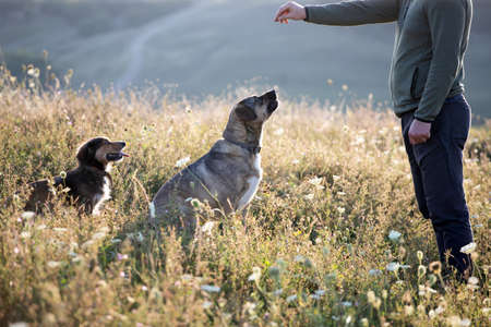Belgian Shepherd puppy playing with a trainer on a field in summer