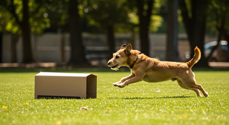 A light brown dog runs through a simple cardboard tunnel in a grassy park. Bright sunlight illuminates the scene, creating a lively outdoor setting. The image is visually appealing and suitable for a variety of commercial or editorial uses.