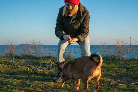 A blonde girl with a purebred dog from the shelter. Playing with a dog on the seashore. Friendship of a dog and a person