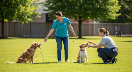 Two professional dog trainers work with two obedient dogs on a large, green grassy field. One trainer stands while gesturing to a golden retriever, and the other kneels by a beagle-mix. This scene depicts dog training, obedience class, and professional pet care.