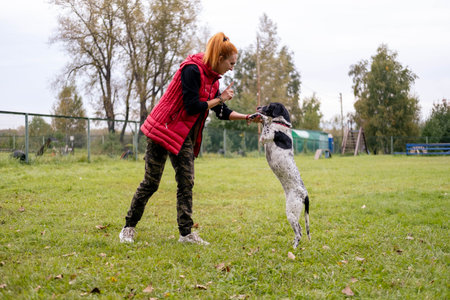 Female dog owner engages with her playful spotted dog in a lush green field, highlighting the joyful interaction and companionship in an outdoor environment