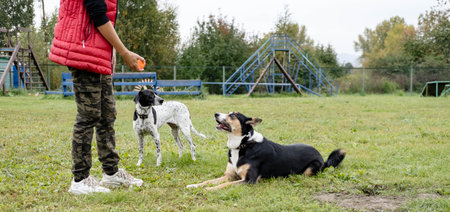 Female dog owner engages with two playful dogs in a grassy park, one dog sitting while the other stands, highlighting the bond between pets and their owner