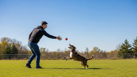 Young caucasian male playing fetch with dog in park on a sunny day.