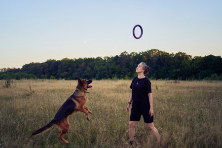 Young European woman runs in park on green grass with German Shepherd dog rear view. Play with flying saucer disc. Have fun with furry human friend.