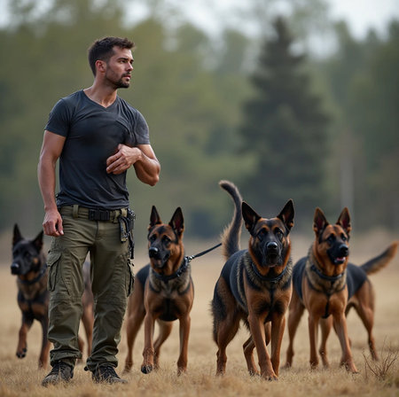 Border Patrol Officer with Trained Belgian Malinois on Duty in Open Field - A Showcase of Security and Loyalty in Law Enforcement