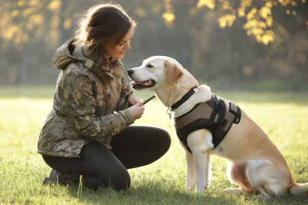 A woman kneels in a grassy area, engaging with her dog wearing a harness on a bright autumn day.