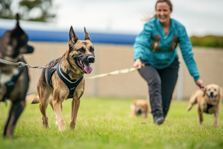 Four dogs are excitedly walking with a trainer in a park during the afternoon, showing their playful spirits.