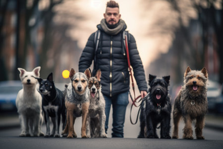 Young man walking with a group of dogs on the city street, Professional Dog Walkers, Dog Walking Business, AI Generated