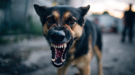 Fierce dog showing its teeth while barking at an intruder, warning to stay away