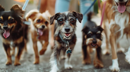 owners walking with their cute pets, joy of dog walking and urban pet care.