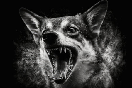 Angry dog bites. Aggressive pet. Picture in black and white. Generative AI