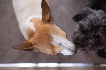 A high angle shot of white and black dogs kissing each other on a blurry background