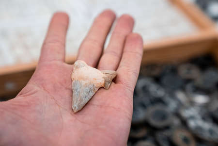 Ancient megalodon shark tooth fossil partially buried in fine sand, revealing its prehistoric grandeur