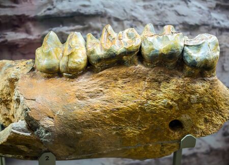 Detail of a mouth full of sharp teeths of a skull fossil of an ancient dinosaur
