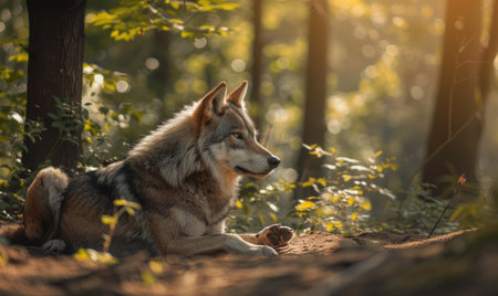 A close-up image showcases a wolf with attentive eyes, set against a blurred forest backdrop. The wolf's fur displays a mix of brown and gray tones, while sunlight filters through the trees. This image may be suitable for editorial content or various commercial projects.