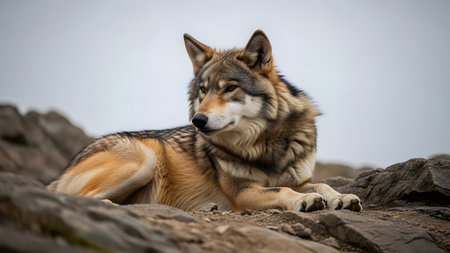 A grey wolf lies resting on rocky terrain with a blurred mountainous background under an overcast sky. The animal looks off to the side, displaying its thick fur and alert posture in its natural wilderness habitat.