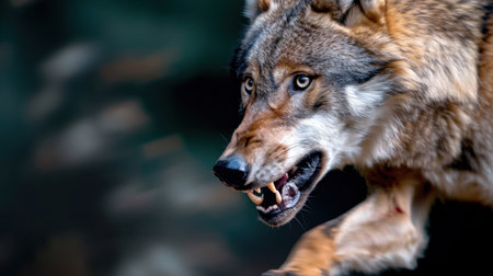 A captivating image of a fierce wolf approaching with an intense expression. Its sharp teeth and alert eyes showcase the wild predator's energy. The blurred background enhances the focus on the wolf, highlighting its natural beauty. Ideal for wildlife enthusiasts and nature lovers.