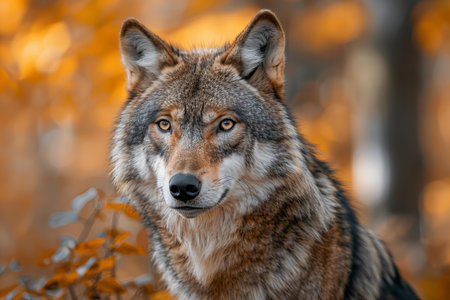Portrait of a gray wolf in the autumn forest with leaves.
