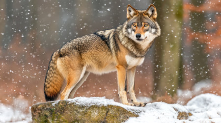 A wolf poses elegantly on a rock in a wintery landscape as soft snow falls around it.