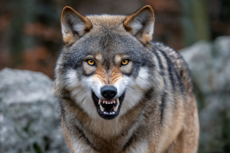Eurasian wolf showing its teeth and snarling in a rocky habitat, displaying aggression and dominance