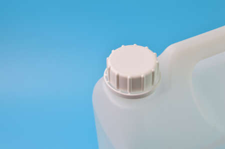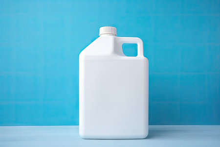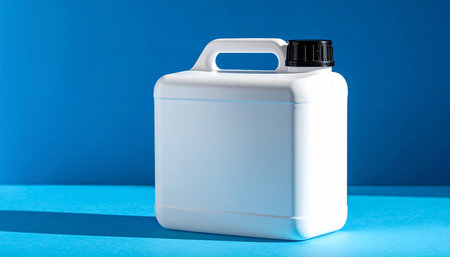 A white plastic jerrycan with a black screw-on cap and a single handle is positioned on a bright blue surface with a shadow.