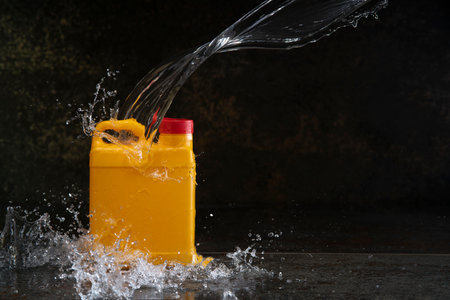 Front view of yellow plastic motor oil bottle splashed by stream of water, container with handle and red screw cap without label against dark background