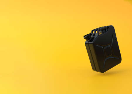 Black Jerrycan gasoline canister on a bright yellow background with copy space. minimal creative concept. 3d render illustration