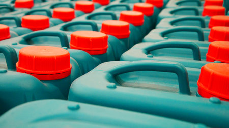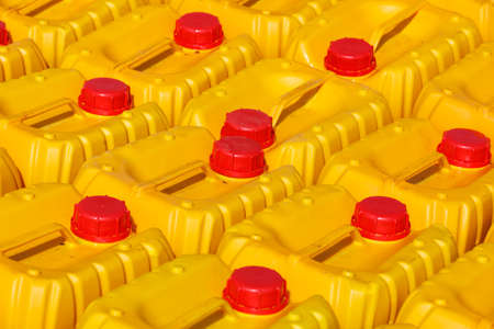 Many beautiful plastic fuel containers with bright red lids standing in a row