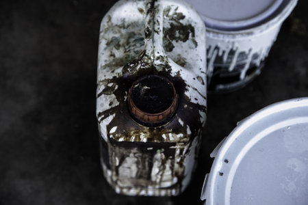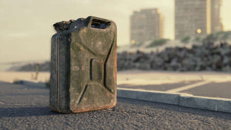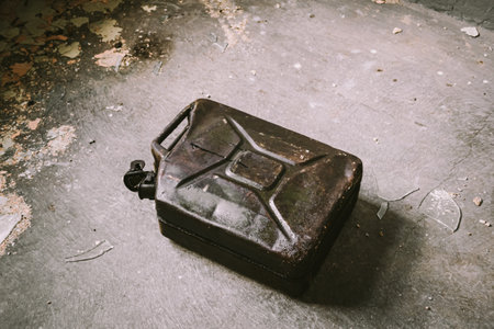 Focus on old dirty jerry can of black petrol