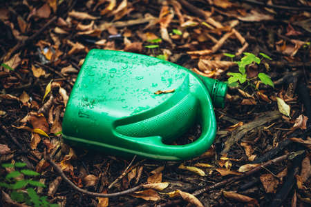 Plastic canister in autumn forest. Toxins into nature everywhere. Jerrycan in park among fallen orange leaves. Contaminated soil. Environmental pollution. Ecological issue. Throw trash anywhere.