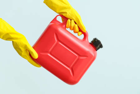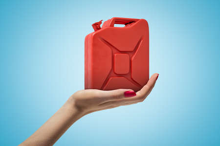 Side closeup of womans hand facing up and holding red metal jerrican on light blue gradient background.