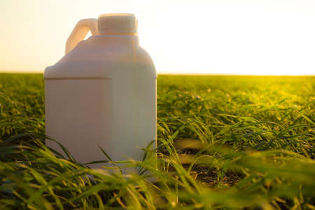White canister against the background of agriculture, canisters from under different types of chemical products.