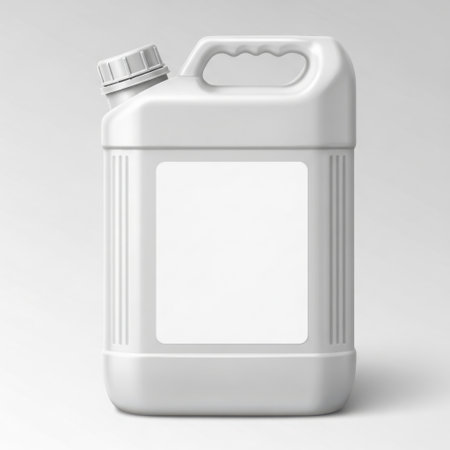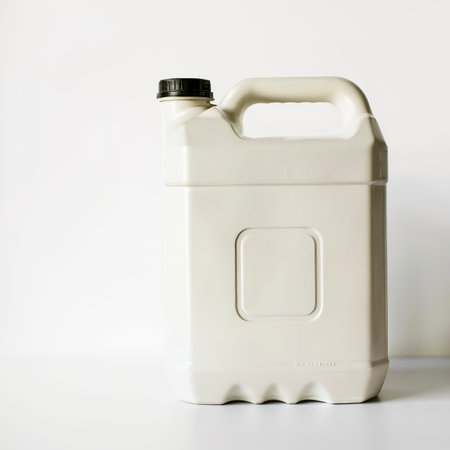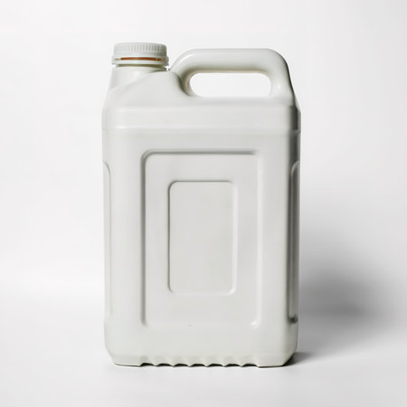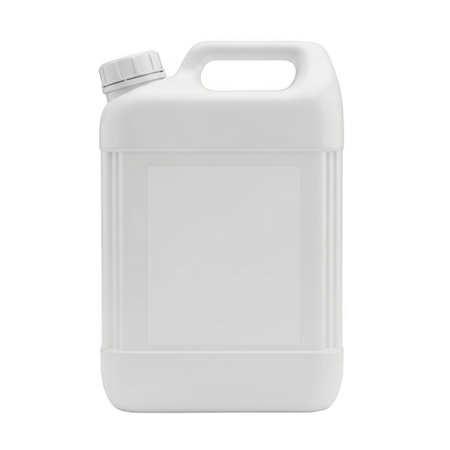 A sturdy utility bottle crafted for holding liquids stands upright on a plain surface. The smooth design and neutral color suggest practicality and cleanliness in a minimalistic setting.