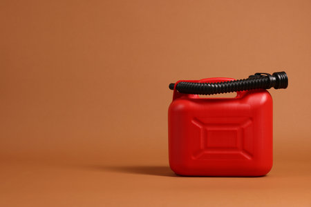 New red plastic canister on brown background. Space for text