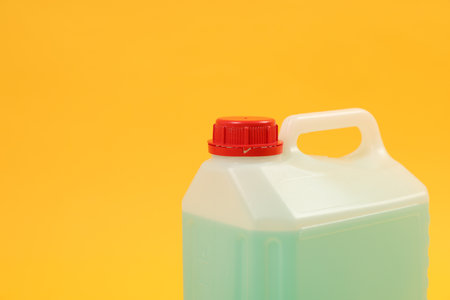 Plastic canister with green liquid on orange background