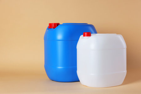 Plastic jerry cans on color background