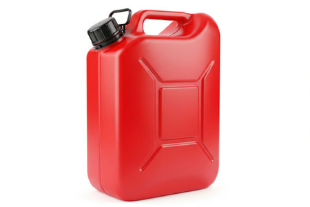 Bright red plastic jerrycan with a black cap, isolated on a clean white background, ready for fuel storage