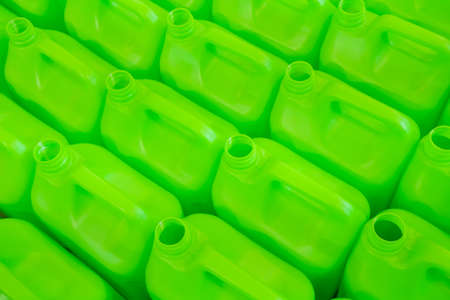 Many empty green plastic jerrycans background in warehouse, market, factory or exhibition - close up
