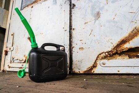 Old, rusted gasoline canister in a workshop. Vintage object and industrial concept.