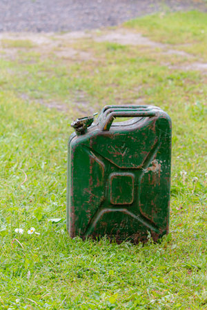 Old green benzin caister stays in green lawn. vertical