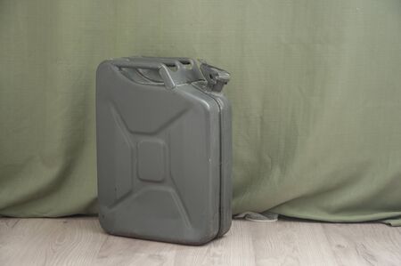 Old green metal fuel tank for transporting and storing petrol