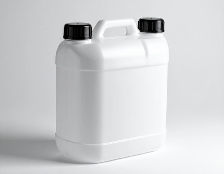 A white plastic jerrycan featuring two black caps and a central handle is presented on a clean white background.
