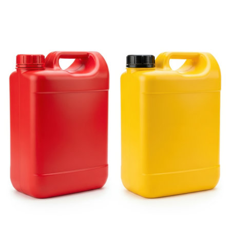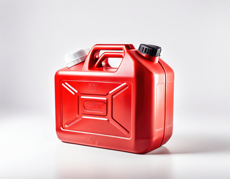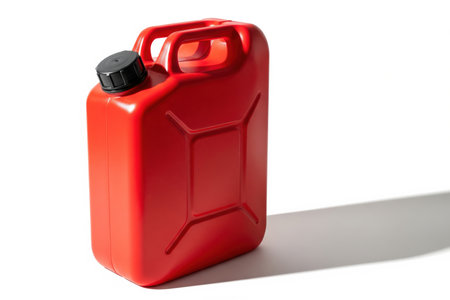 Bright red plastic jerrycan with a black cap, isolated on a clean white background, ready for fuel storage