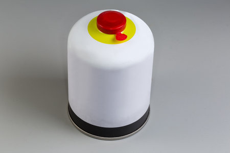 Disposable metal gas cartridge for camp stove with connection closed with a cap on a gray background