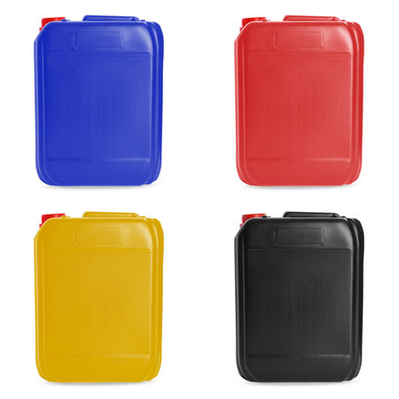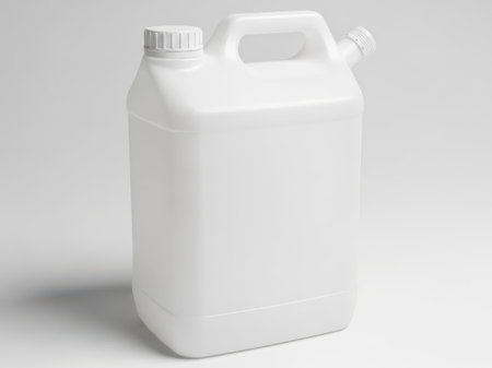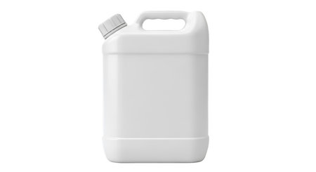 The image features a plastic jerry can isolated on a white background. The jerry can is designed with a handle for easy carrying and a screw-on cap for secure closure. This type of container is commonly used for storing and transporting liquids such as water, fuel, or other chemicals. The white background provides a clean and uncluttered setting, highlighting the jerry can as the primary focus of the image.
