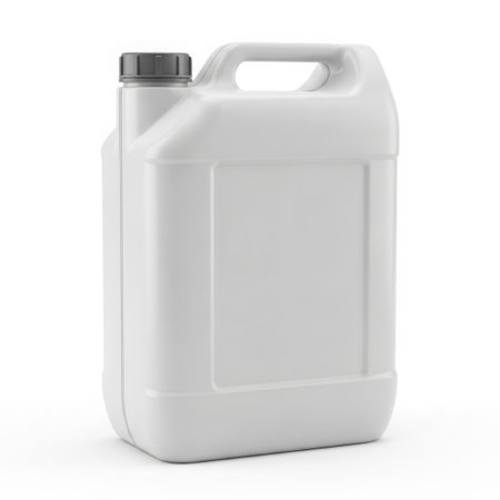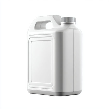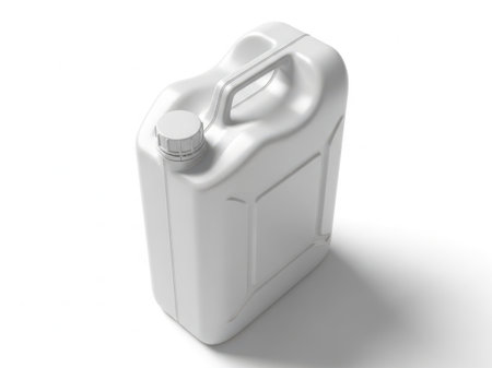 The image features a plastic jerry can isolated on a white background. The jerry can is designed with a handle on top and a spout for pouring liquids. It is depicted in a three-quarter view, emphasizing its functional design and utility.