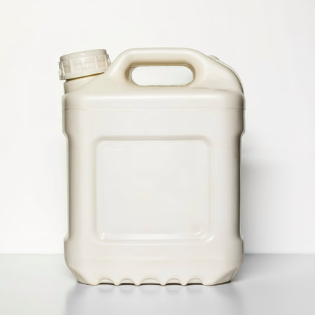 A sturdy utility bottle crafted for holding liquids stands upright on a plain surface. The smooth design and neutral color suggest practicality and cleanliness in a minimalistic setting.