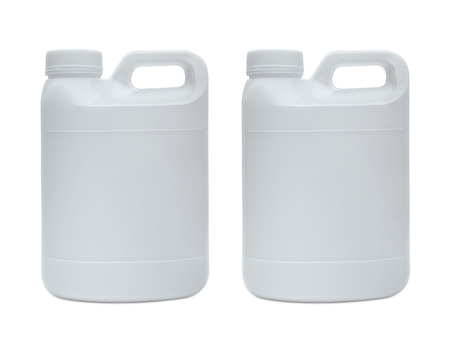 Plastic chemical gallon containers with green cap in two sizes, isolated on white background with some cast shadow, room for copyspace text