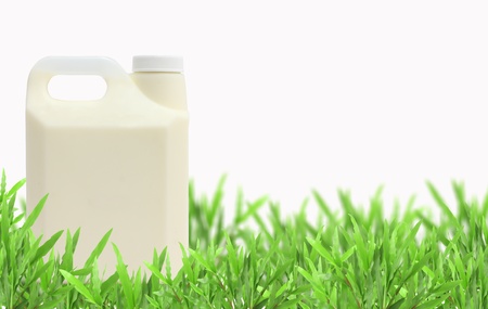 White canister against the background of agriculture, canisters from under different types of chemical products.