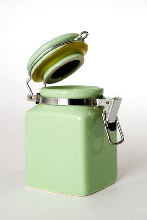 white plastic canister on a white table, isolated on black background